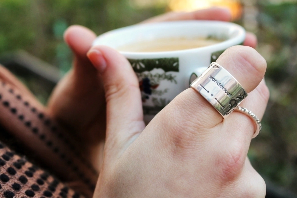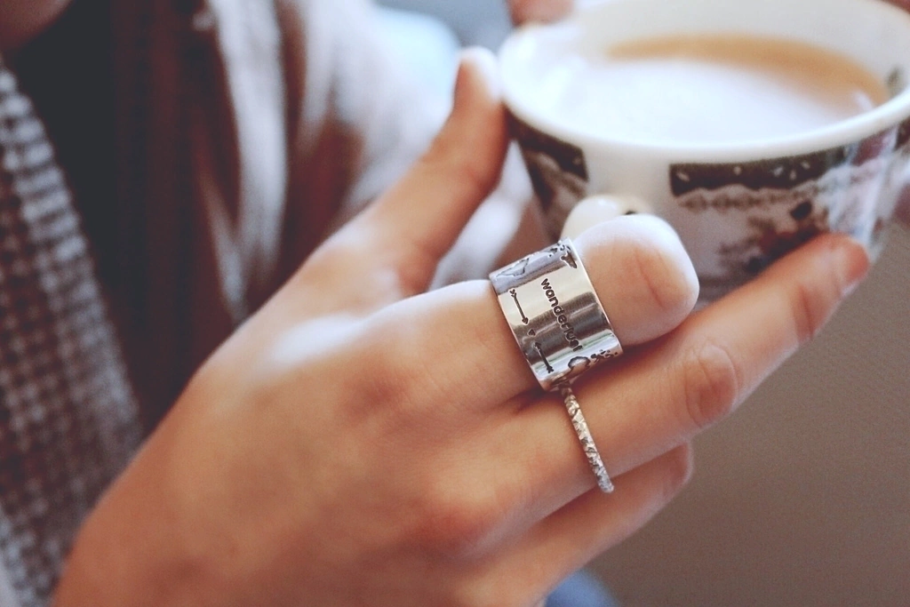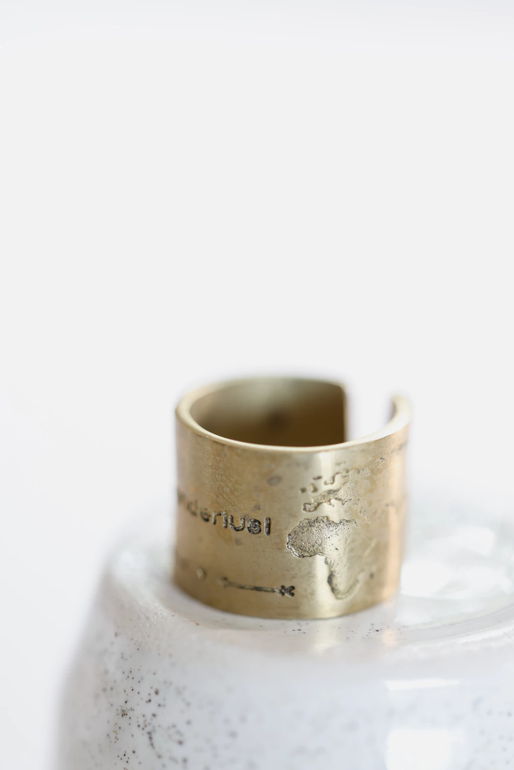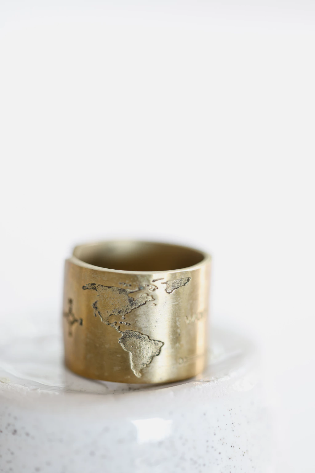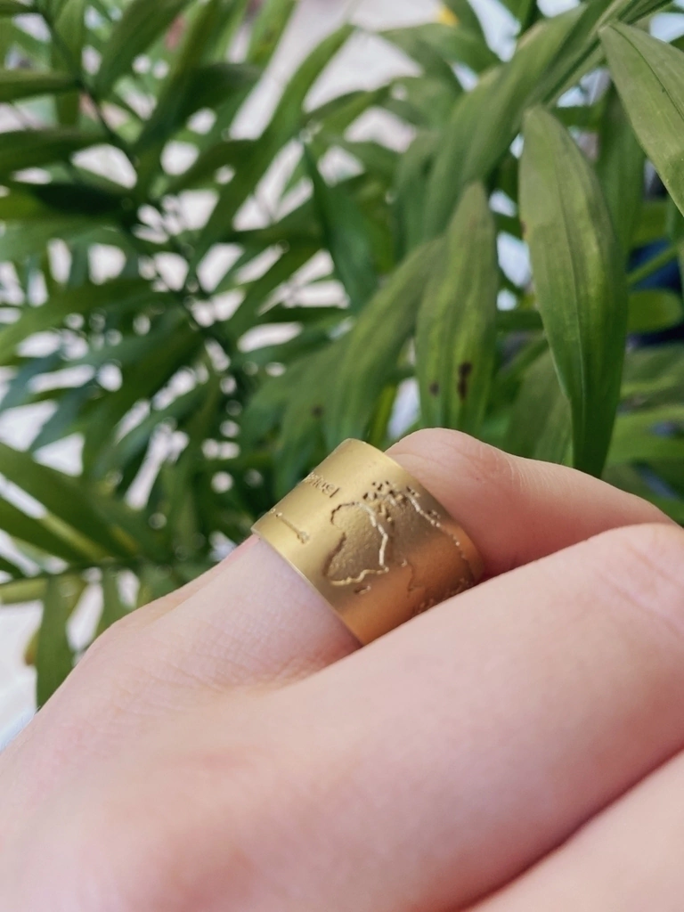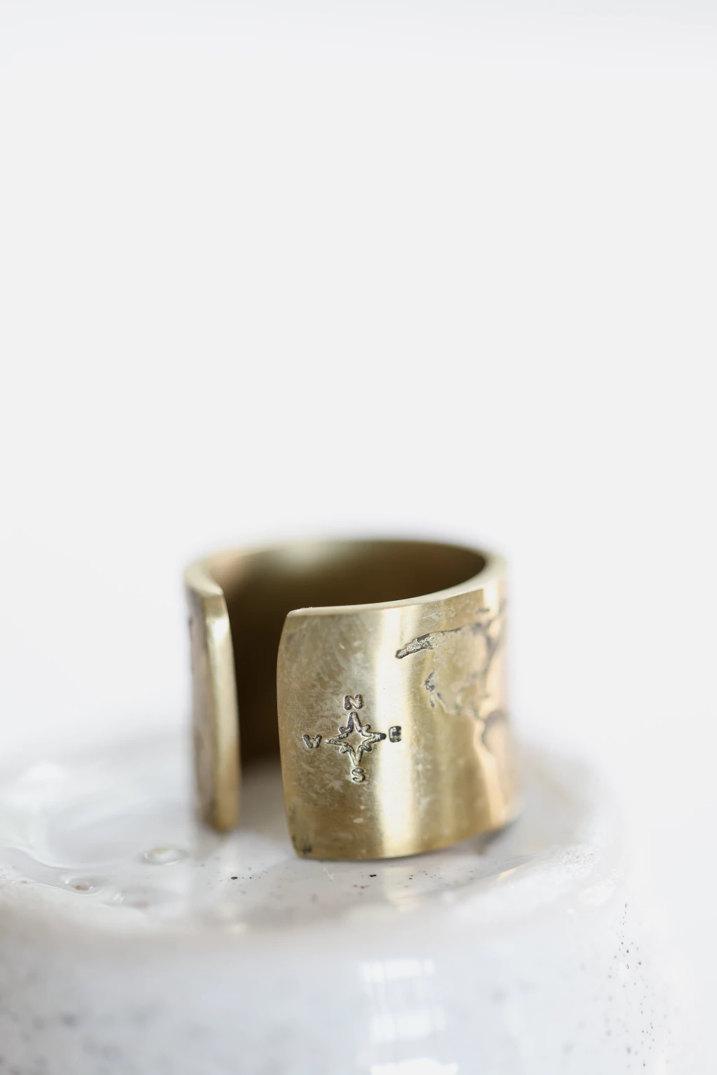 Anillo de bronce puro con grabado de frase wanderlust, mapamundi y Estrella del norte con puntos cardinales.