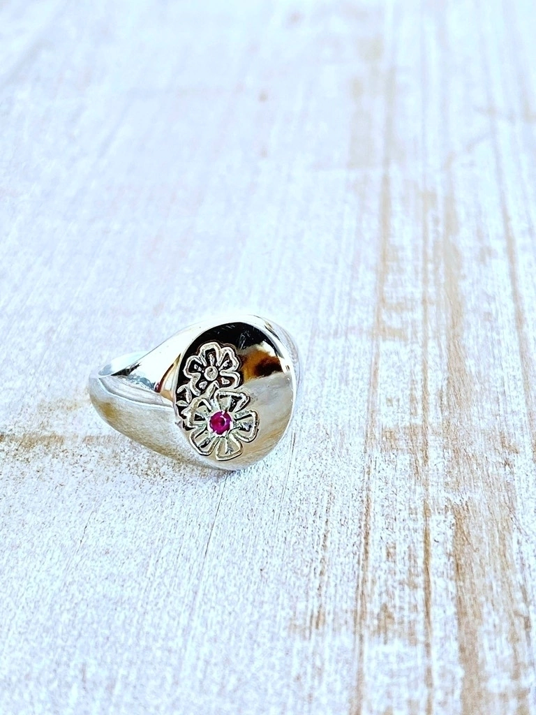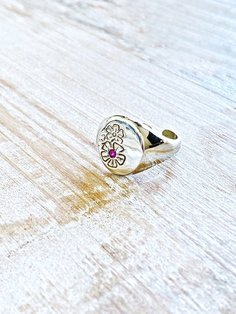 Anillo de alpaca macizo con grabado a mano de flor de cerato con piedra preciosa de rubí facetada corte diamante original.