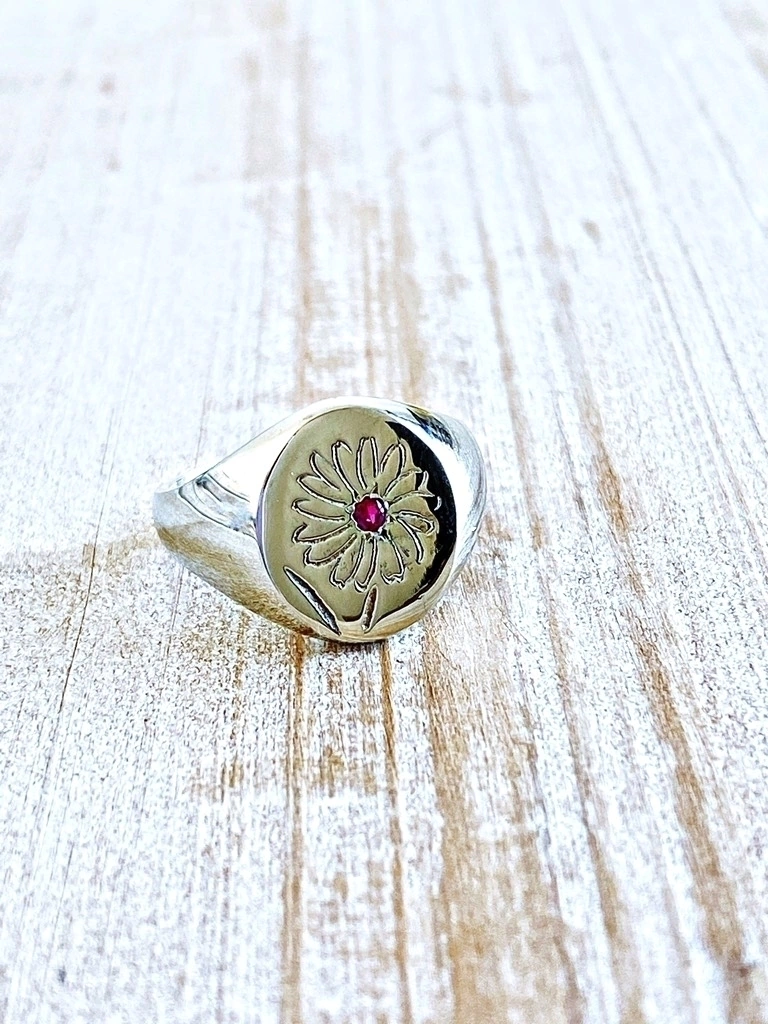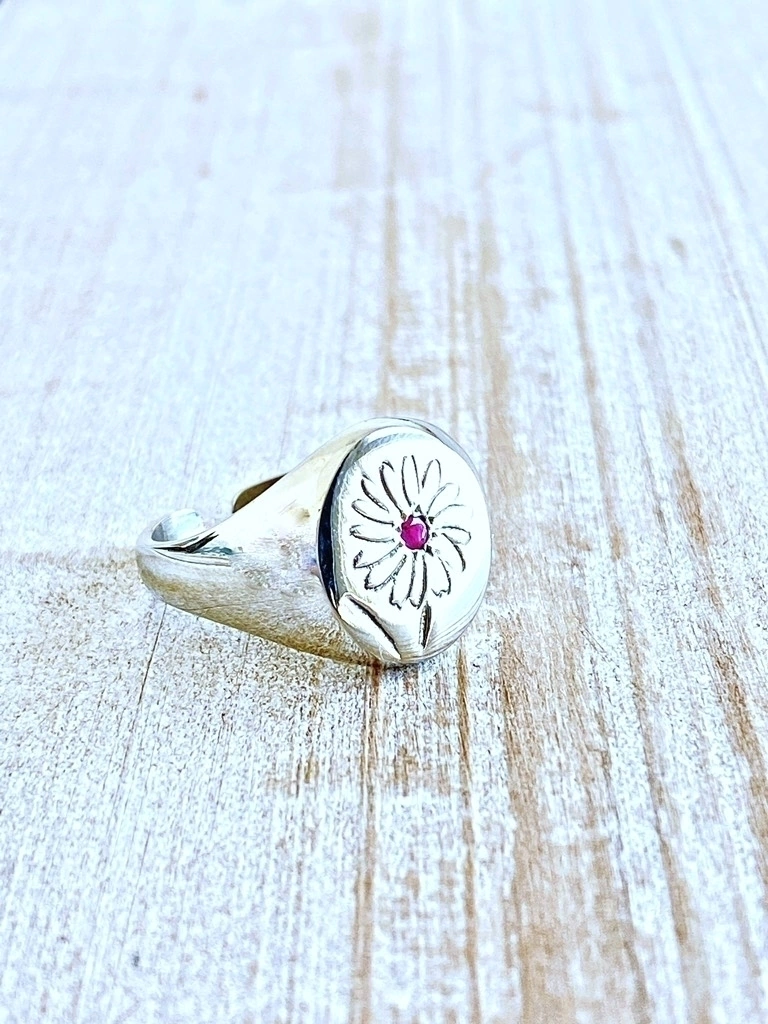 Anillo de alpaca macizo con grabado a mano de flor de chicory con piedra preciosa de rubí facetada corte diamante original.