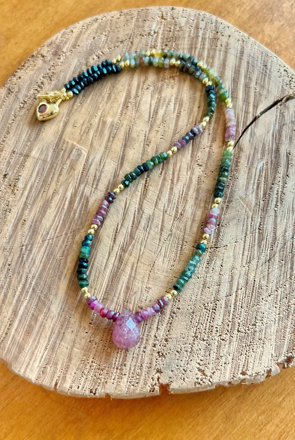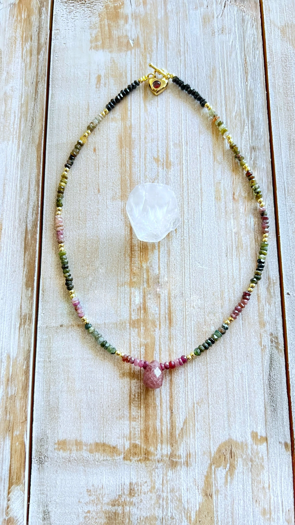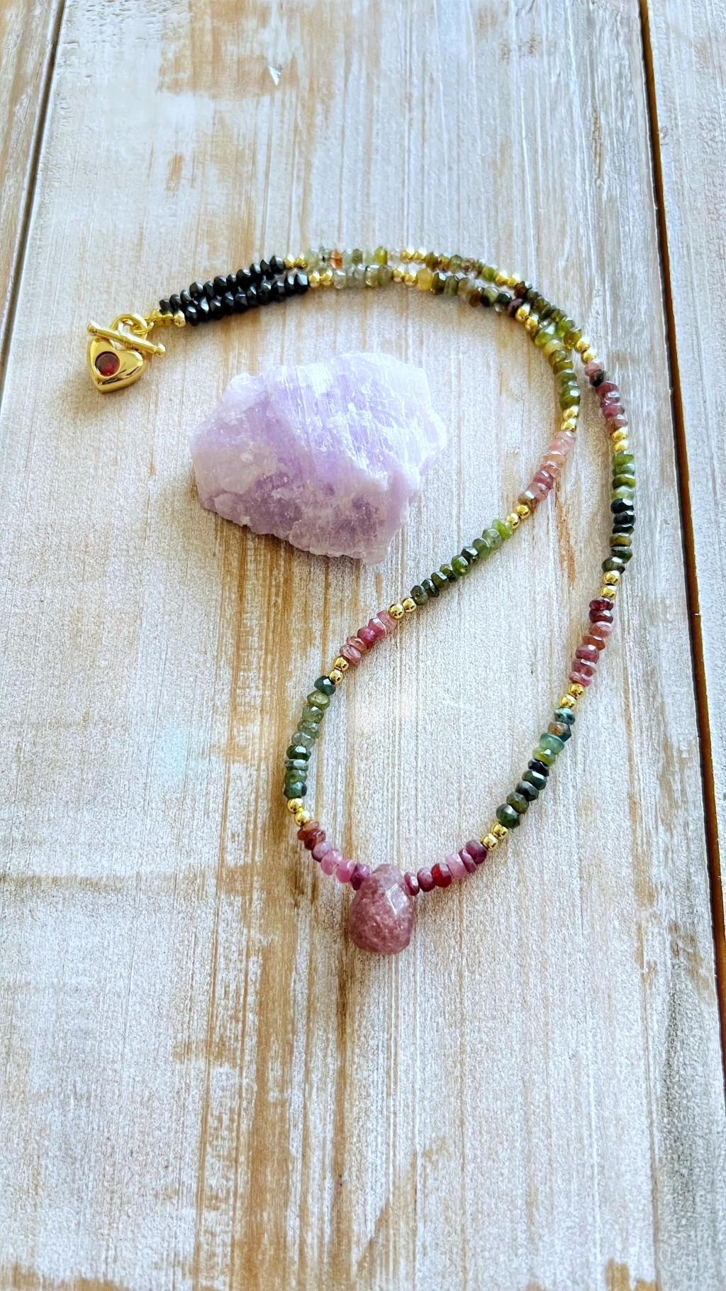 Collar gargantilla de piedras semipreciosas de turmalinas facetadas rondel originales con gota de cuarzo cherry facetado
