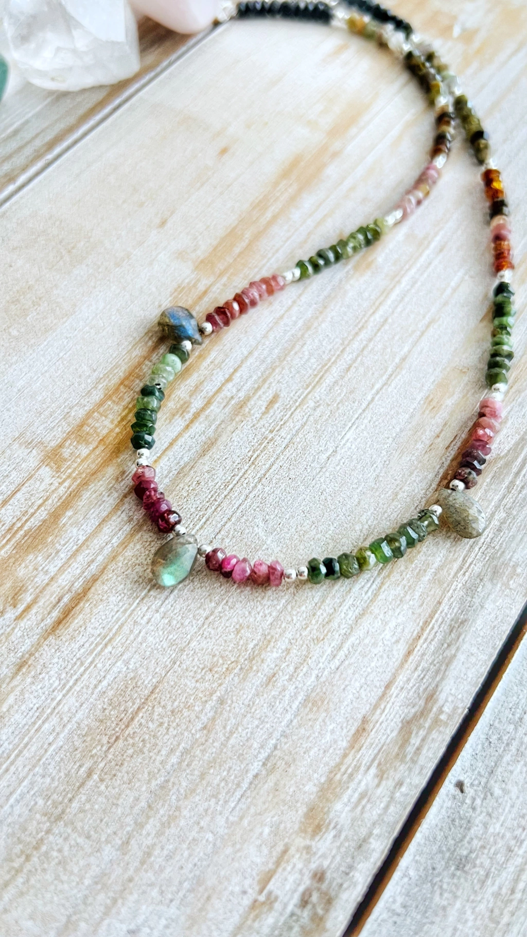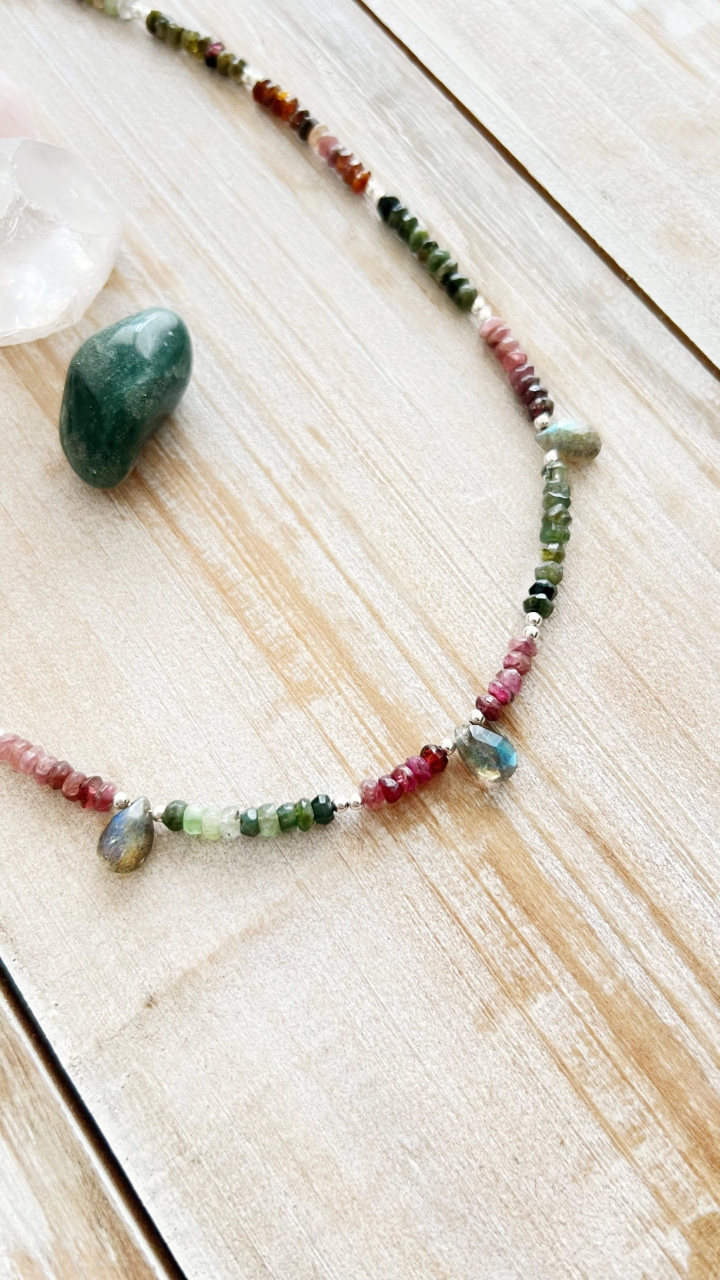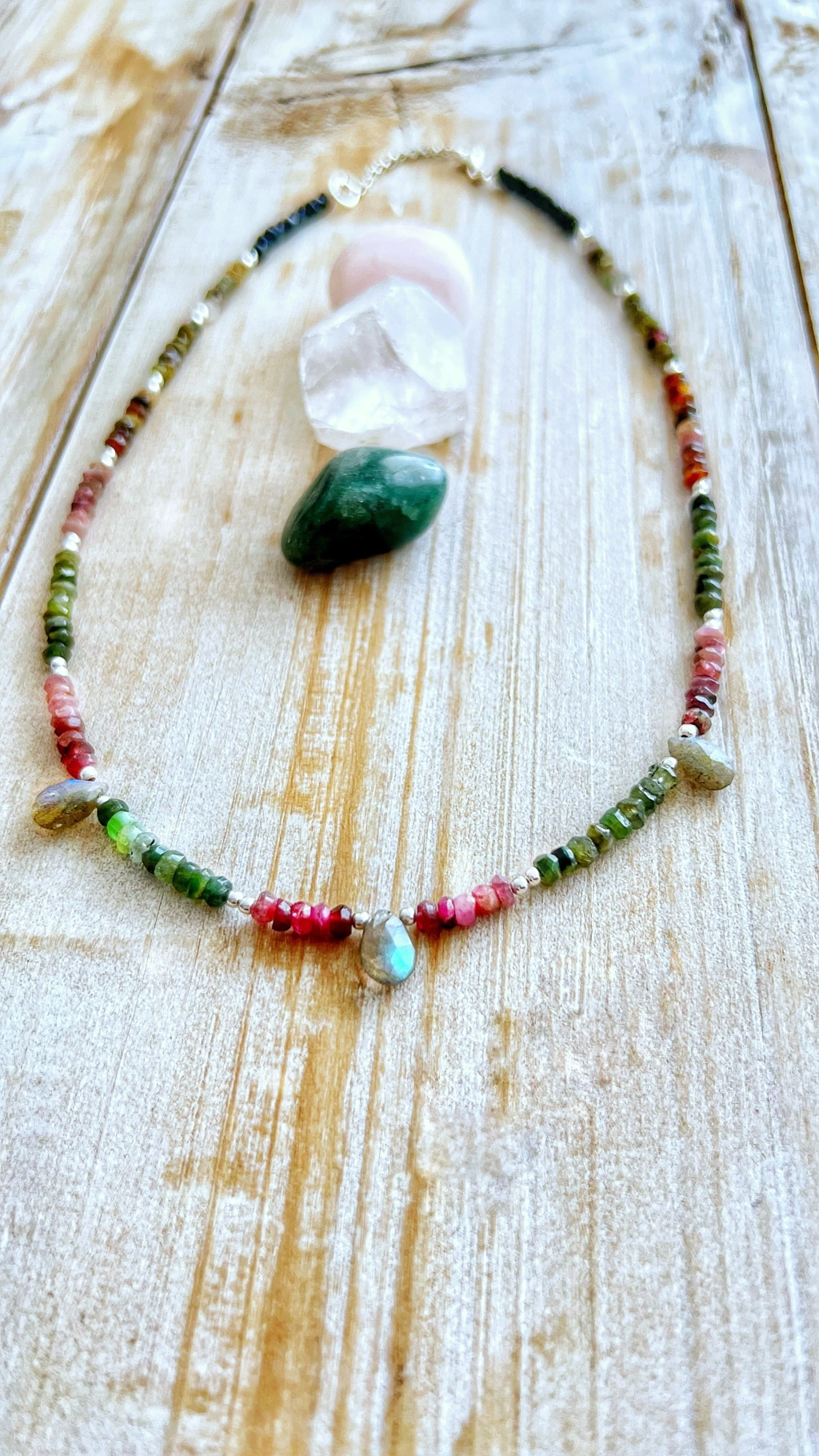 Collar gargantilla de piedras semipreciosas de turmalinas facetadas rondel originales con gotitas facetadas de piedra labradorita de la India original.