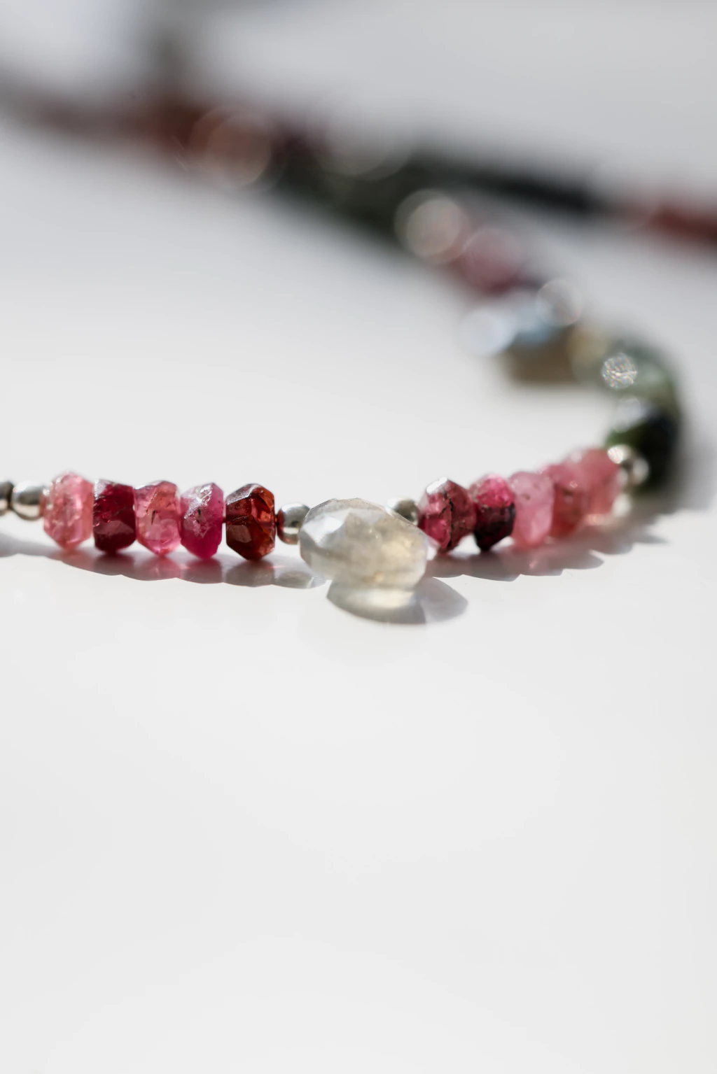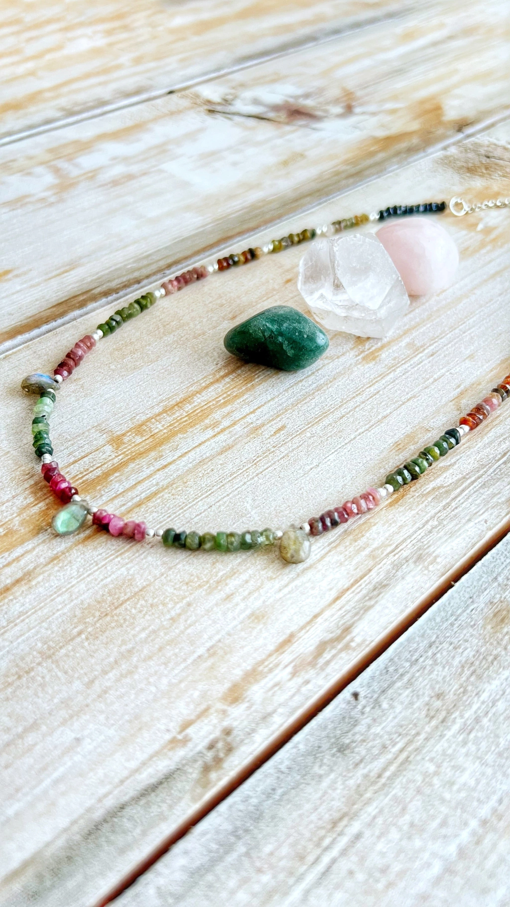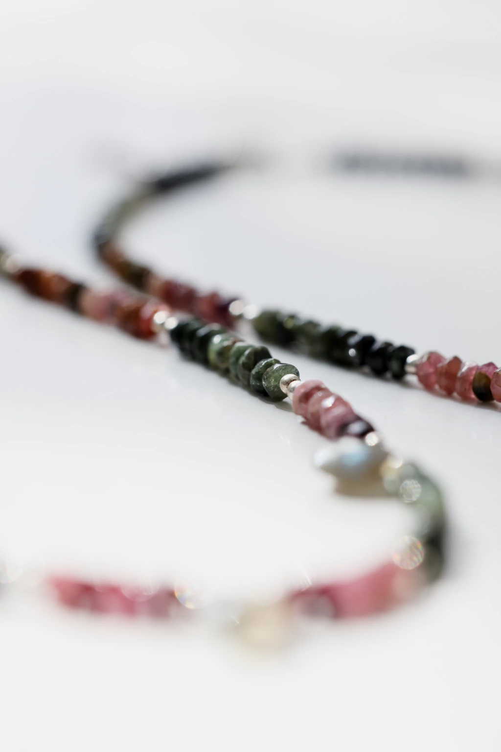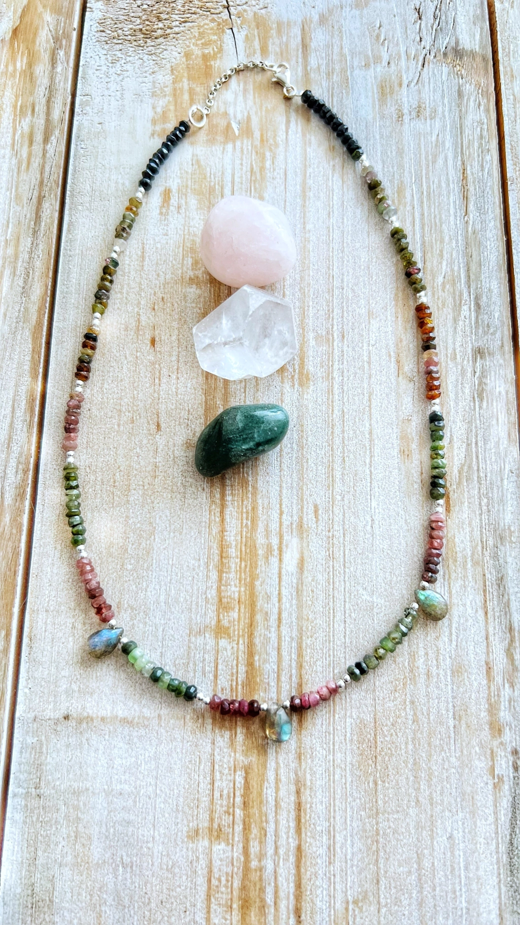 Collar gargantilla de piedras semipreciosas de turmalinas facetadas rondel originales con gotitas facetadas de piedra labradorita de la India original.