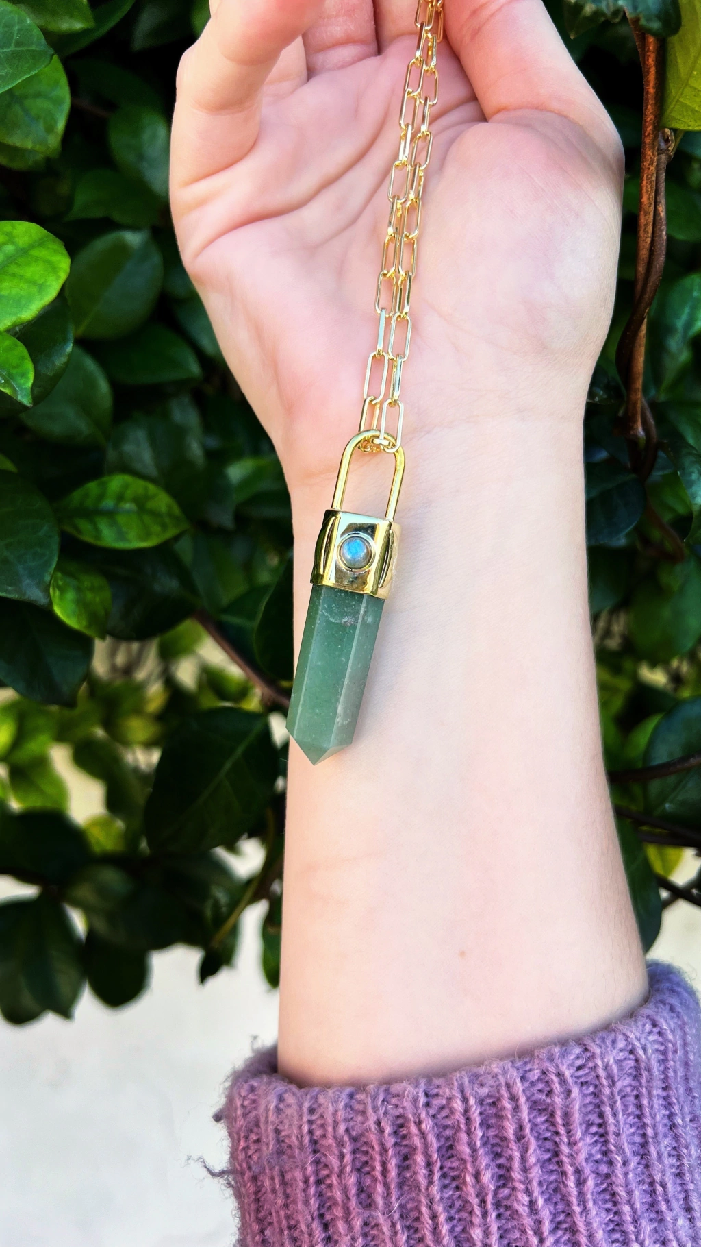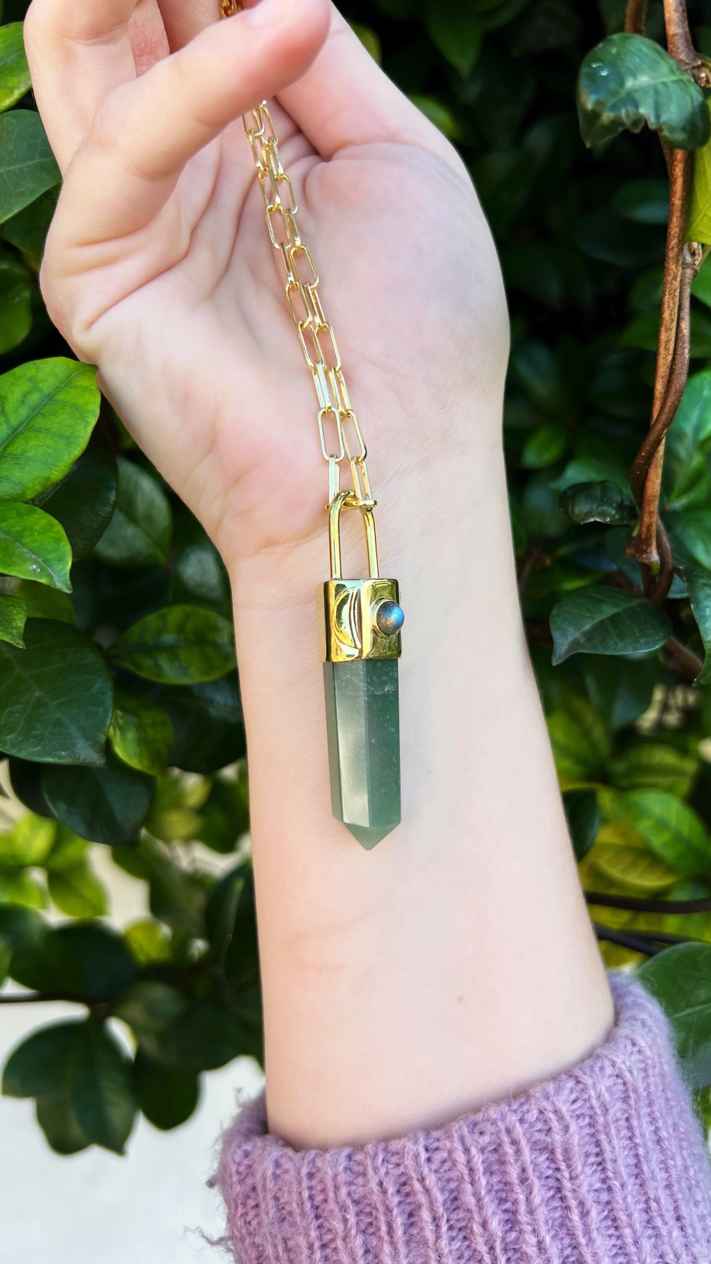 Collar de bronce macizo enchapado en oro 24k de punta pulida hexagonal de piedra semipreciosa de cuarzo verde original con gotita de labradorita de la india y diseño de lunas a los costados. Incluye cadena bronce dorada de goldfilled de oro 24k muy resistente de 60 cm de largo, la cadena puede variar a la de la foto, dependen del stock al momento de la compra pero siempre es el mismo material y mismo largo.