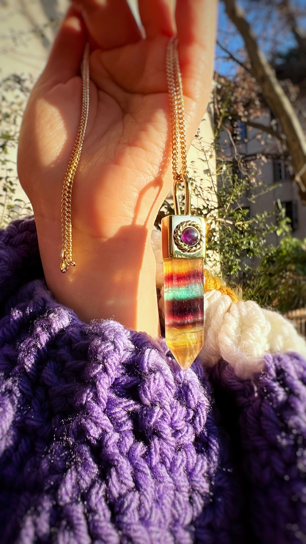 Collar de bronce enchapado en oro 24k macizo de punta pulida hexagonal de piedra semipreciosa de Fluorita arcoiris original con gotita de amatista y diseño de lunas a los costados.Incluye cadena bronce dorada de goldfilled de oro 24k muy resistente de 60 cm de largo, la cadena puede variar a la de la foto, dependen del stock al momento de la compra pero siempre es el mismo material y mismo largo.