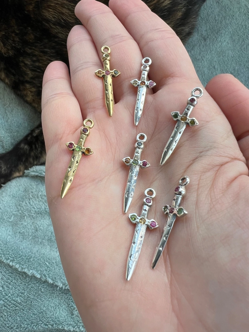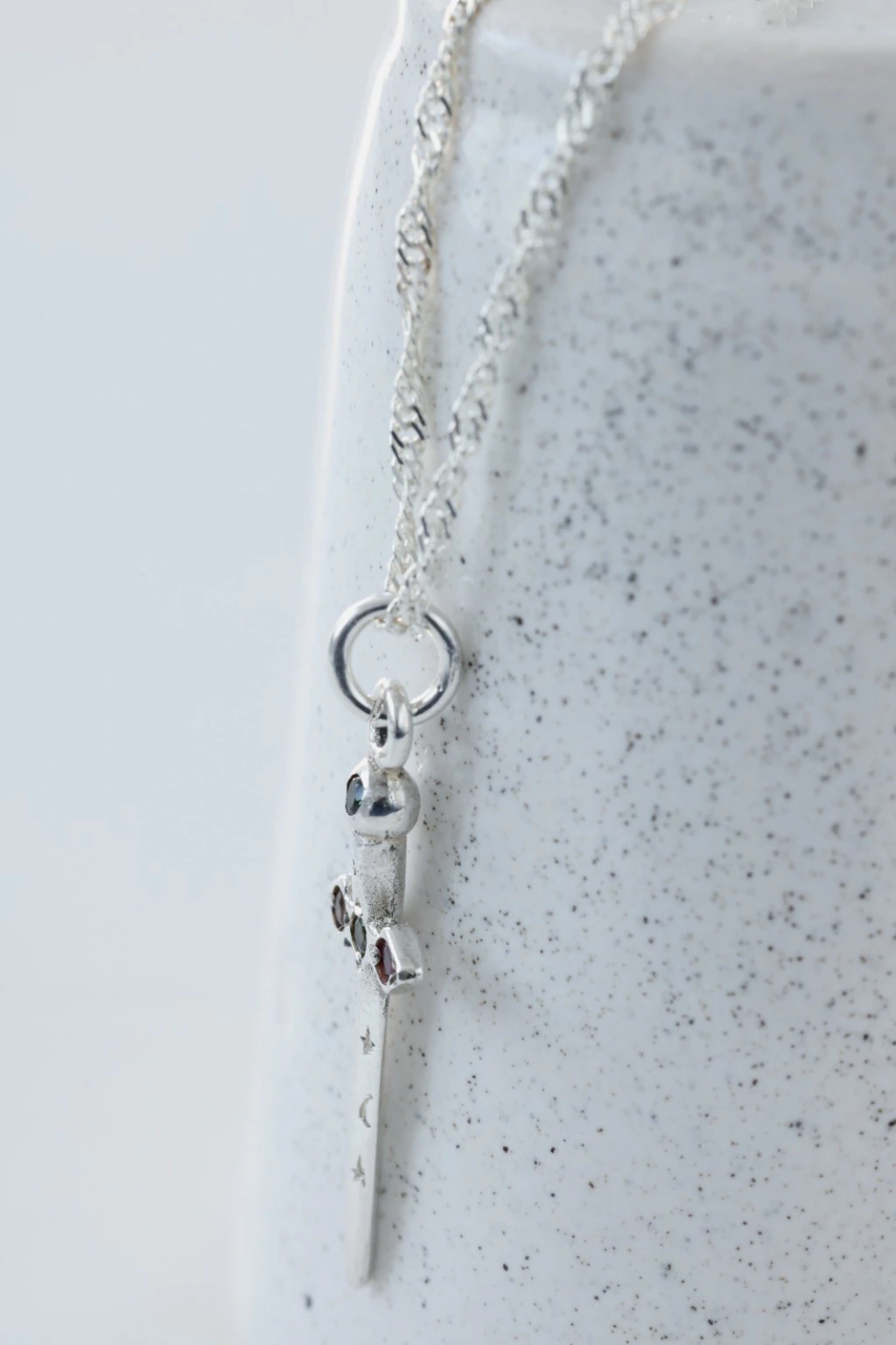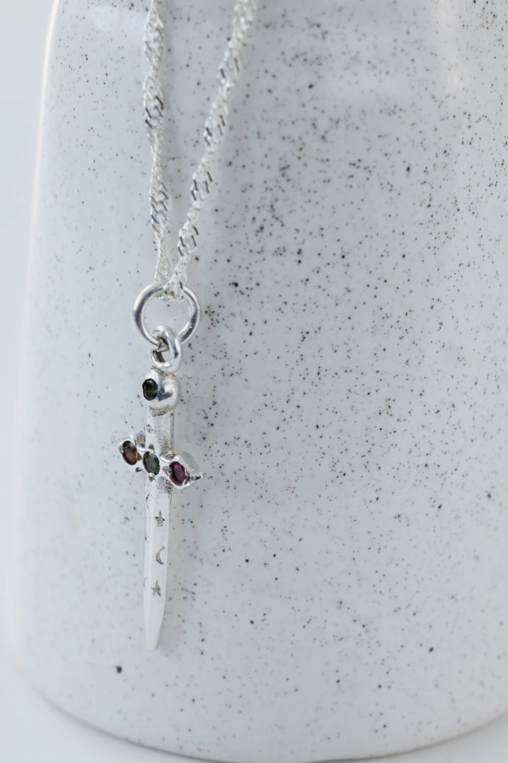 Collar de plata 925 maciza de espada con grabado de Estrellas y lunas, con piedras semipreciosas de turmalinas de colores facetadas originales.