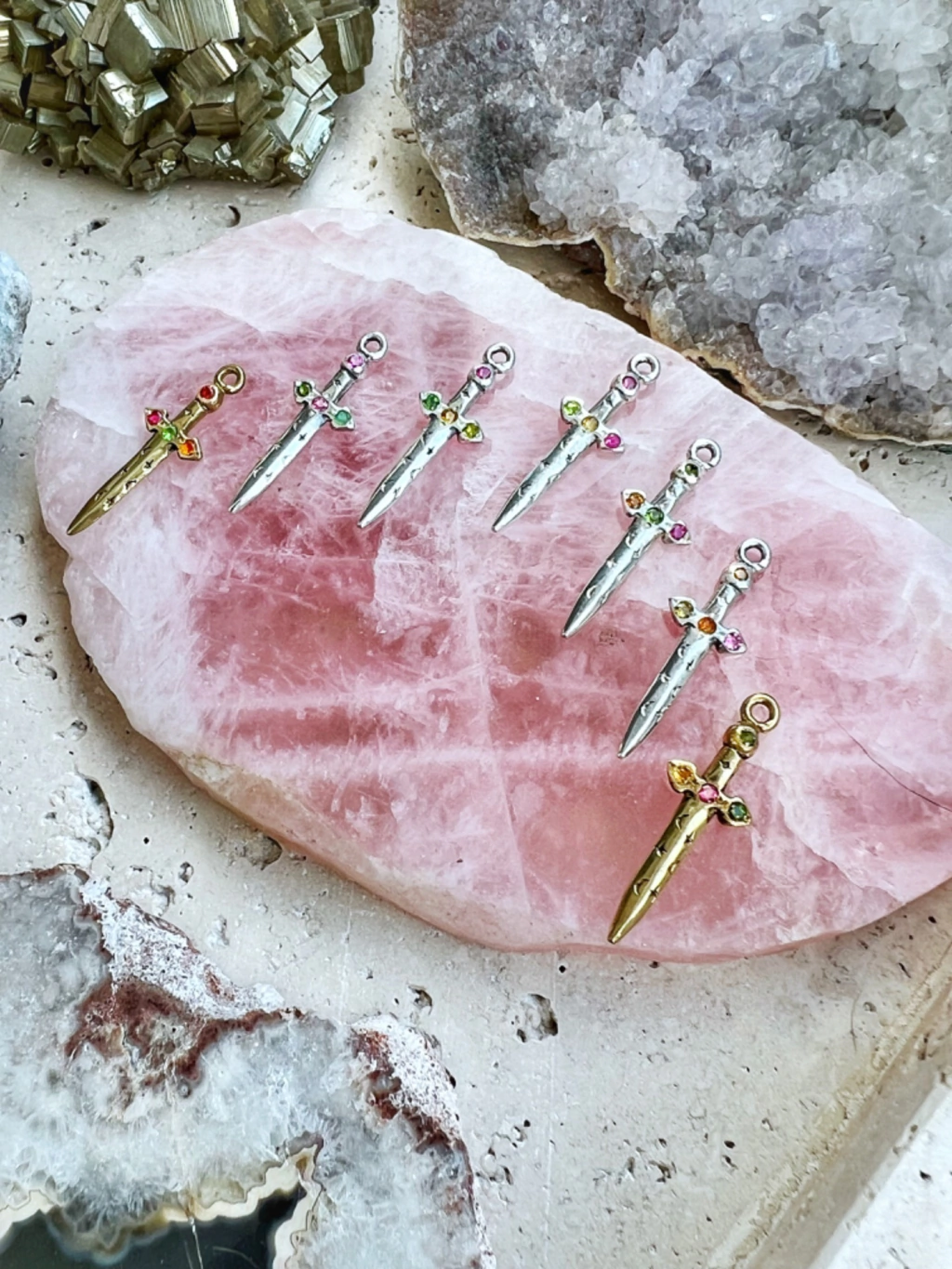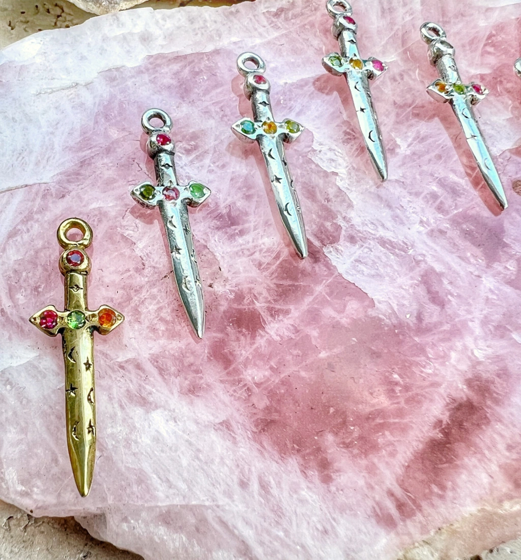 Collar de bronce macizo enchapado en oro 24k de espada con grabado de Estrellas y lunas, con piedras semipreciosas de turmalinas de colores facetadas originales. viene con Cadena de 50/60 cm tambien en bronce enchapado en oro amarillo.