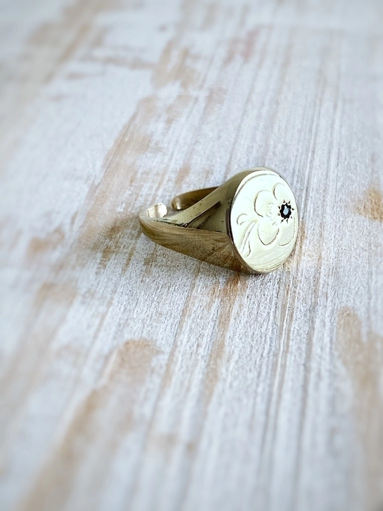 Anillo de bronce macizo con grabado a mano de flor de rock rose con piedra preciosa de zafiro corte diamante original.