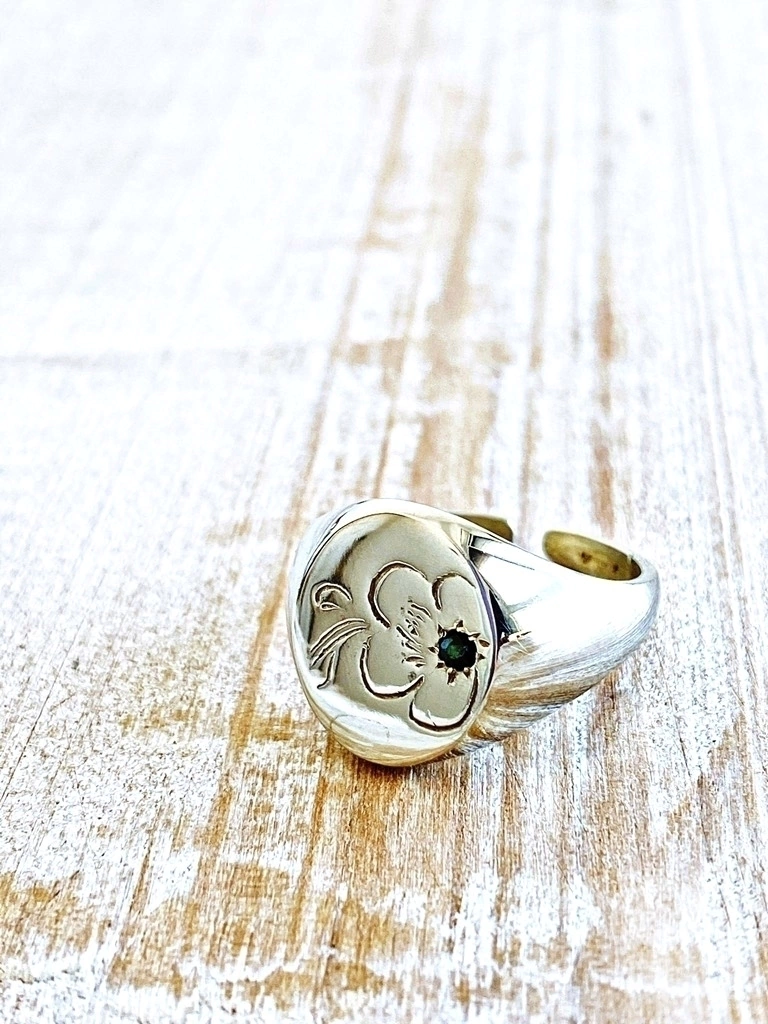Anillo de alpaca macizo con grabado a mano de flor de rock rose con piedra preciosa de zafiro facetada corte diamante original.