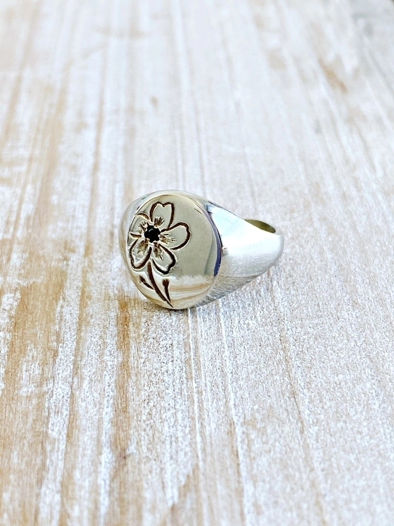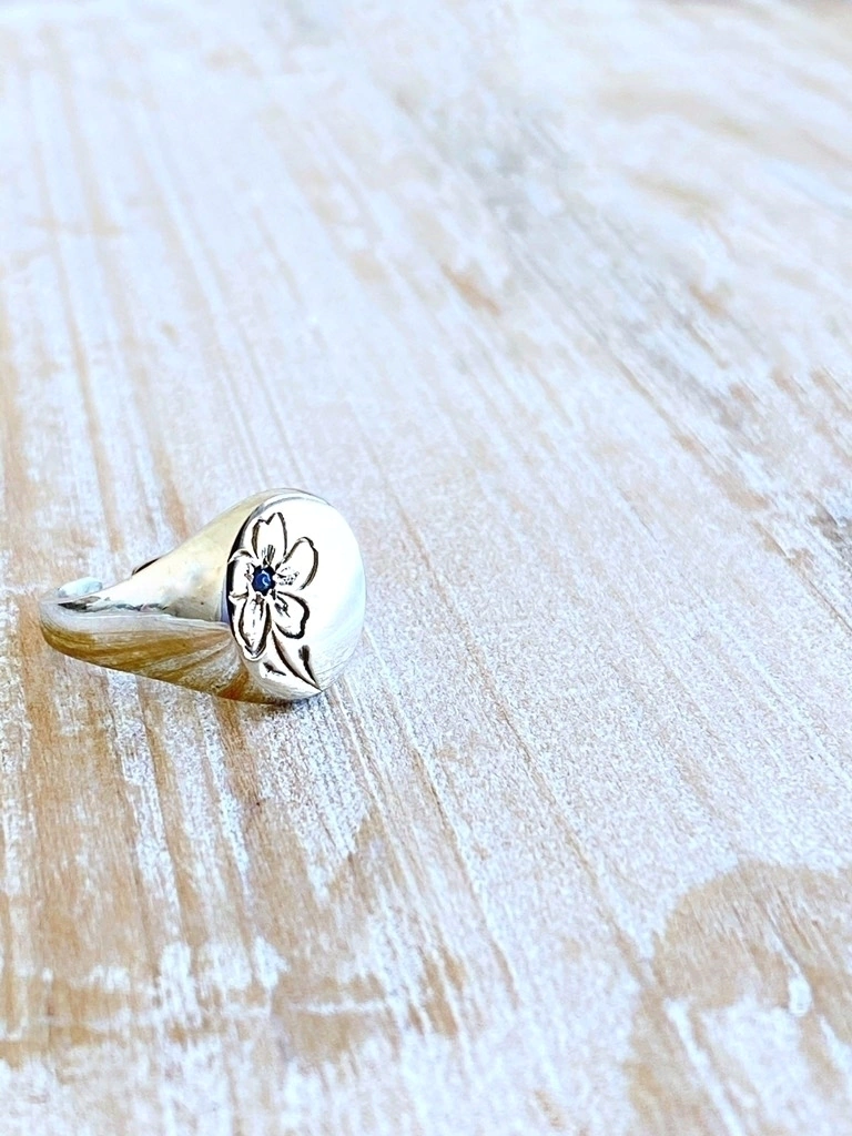 Anillo de alpaca macizo con grabado a mano de flor de water violet con piedra preciosa de zafiro facetada corte diamante original.